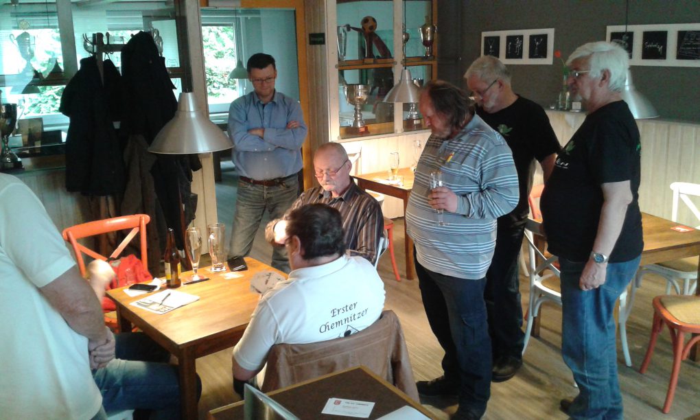 Und wieder einmal hatten wir das Vergnügen Skatspieler bei uns begrüßen zu dürfen. Nur im Gegensatz zu unserem aller 8 Wochen stattfindenden Freizeitskat gab sich am 16.04. die Skatliga zu Ihrem Punktspiel die Ehre. Bernd Eckart mit seinen Froschlandbuben Stelzendorf trafen auf die Sportfreunde des 1. Chemnitzer Skatclubs mit unserem Spfr. Volker Kloß. Hier wurde nicht lange diskutiert, man begrüßte sich, nahm Platz und schon hatten die ersten ne 18 ausgerufen. 7h später waren 3 Runden gespielt, alle waren mehr oder weniger zu frieden und wir hatten das Gefühl man sieht sich bestimmt wieder.